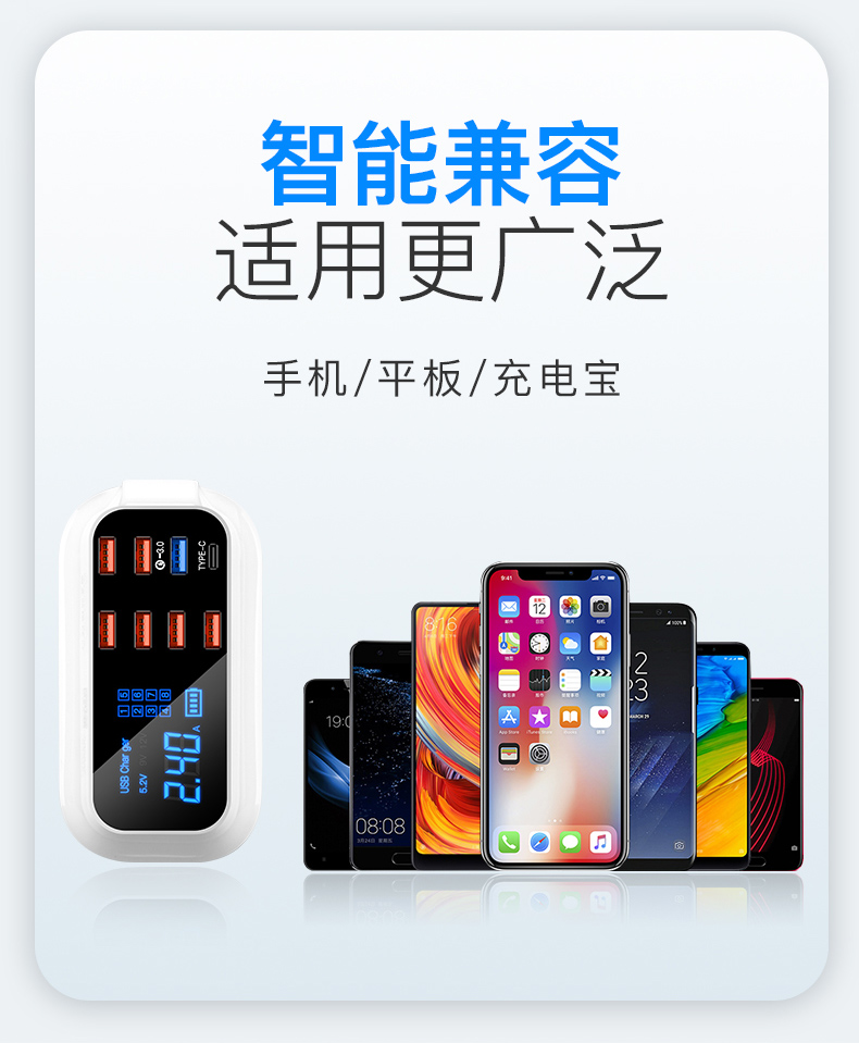 卓际 多功能智能排插多孔数显usb插座MIHUAWEIAppleスマホワイヤレス充電器QC3.0闪充PD充電通用电源 8口曲面款(充電版)【USB接口*6+QC3.0接