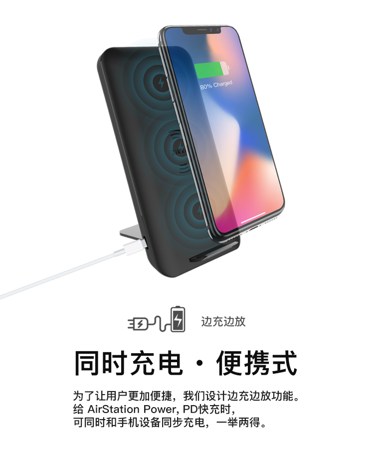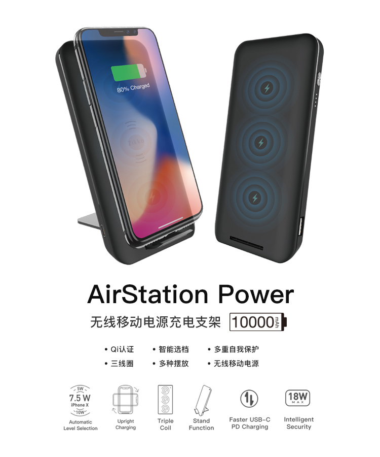即刻(Zikko)AirStation Power ワイヤレス充電器 USB-C PD充電移动电源桌面支柱 三线圈无线充电宝10000mAh(黑色)