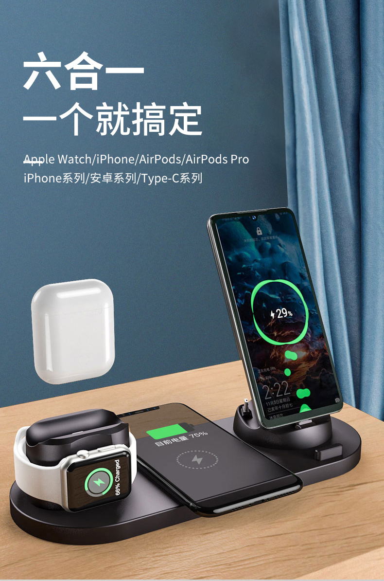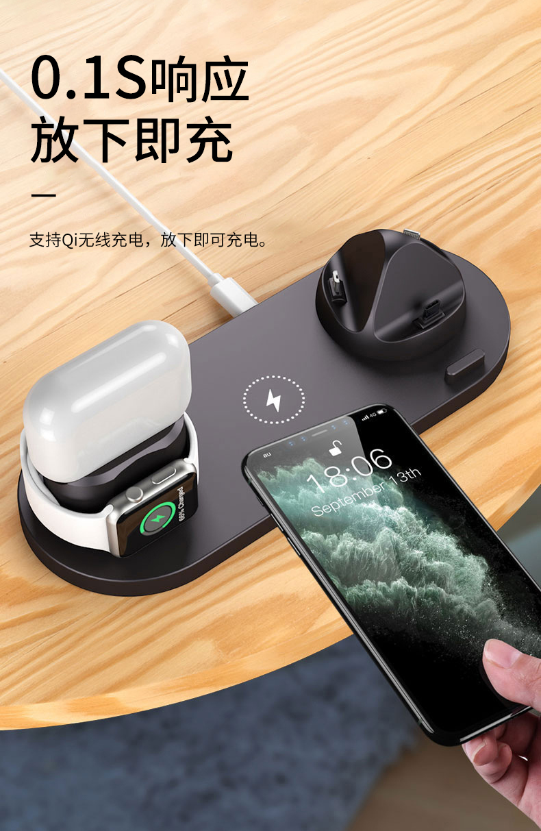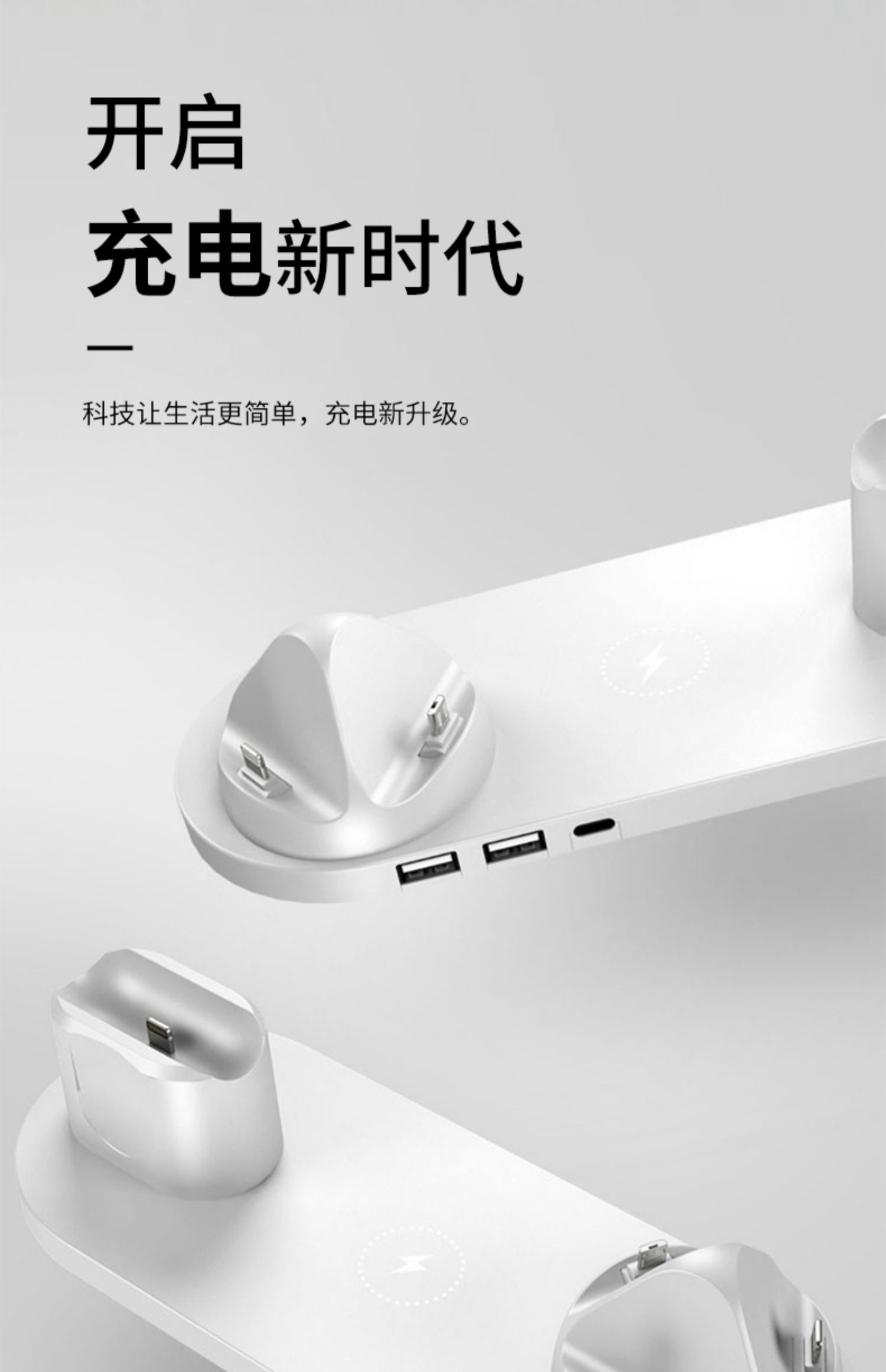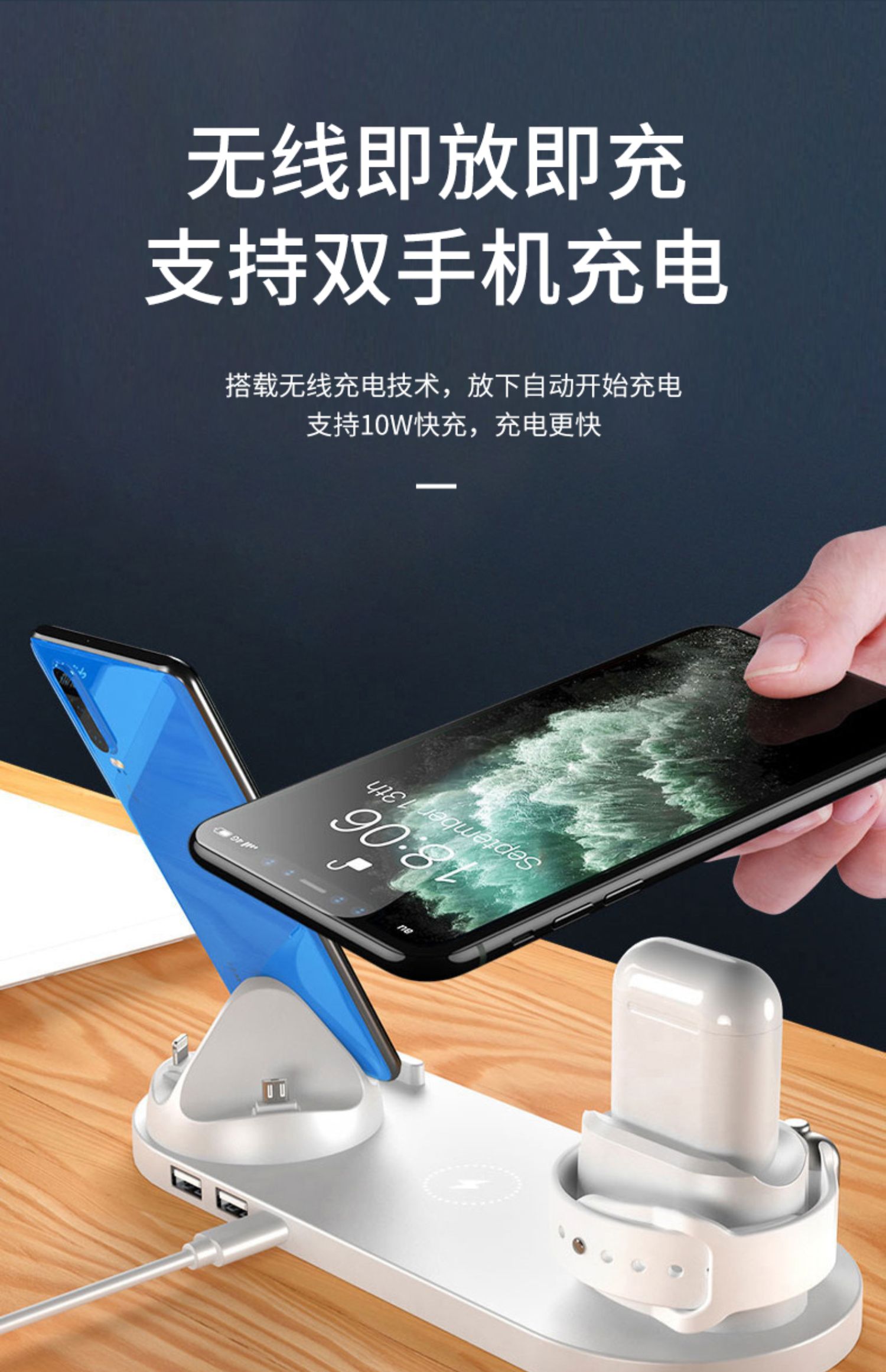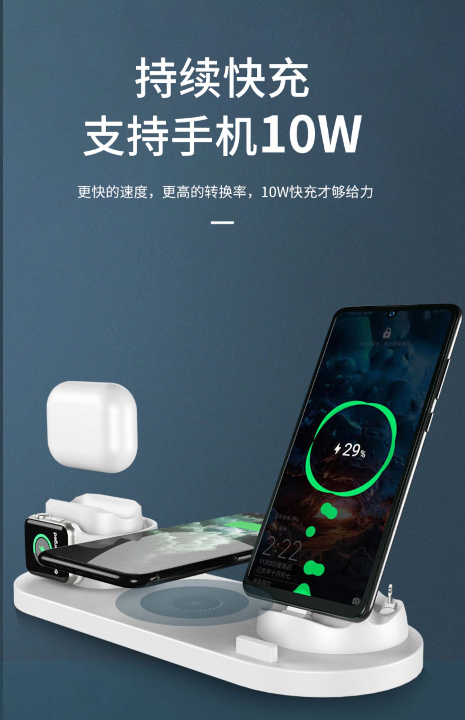 スマホワイアレス充電器iPhone時計apple多機能充電汎用Airpods三合一体イヤホンホルダーWT.WS 5六合一無線充電【白】