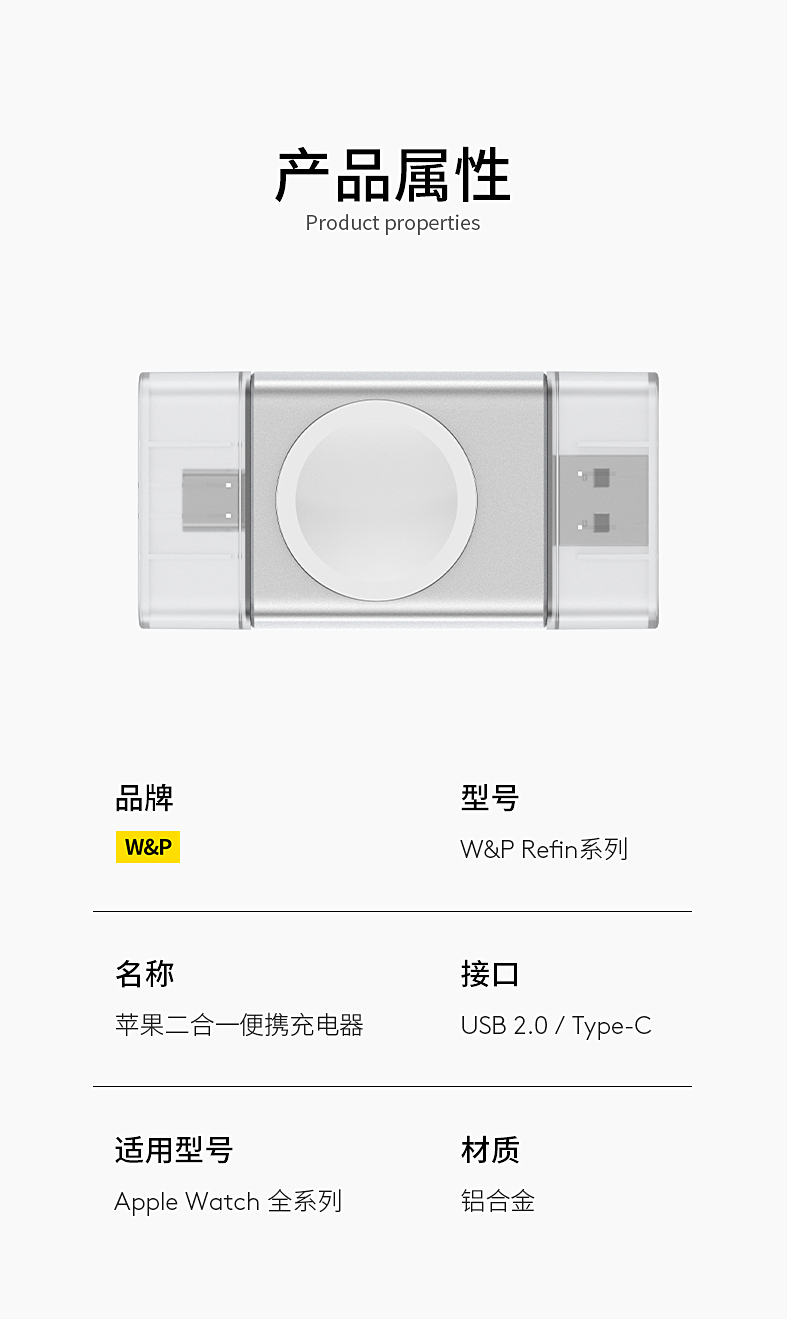 【W&PWP-SBCDQ-02】W&P 【美国】Apple手表充电器iwatch无线充电适用AppleWatch7/6/5/4/3/SE 【TYPE-C/USB二合一便携款】·冰霜银【行情 报价 价格